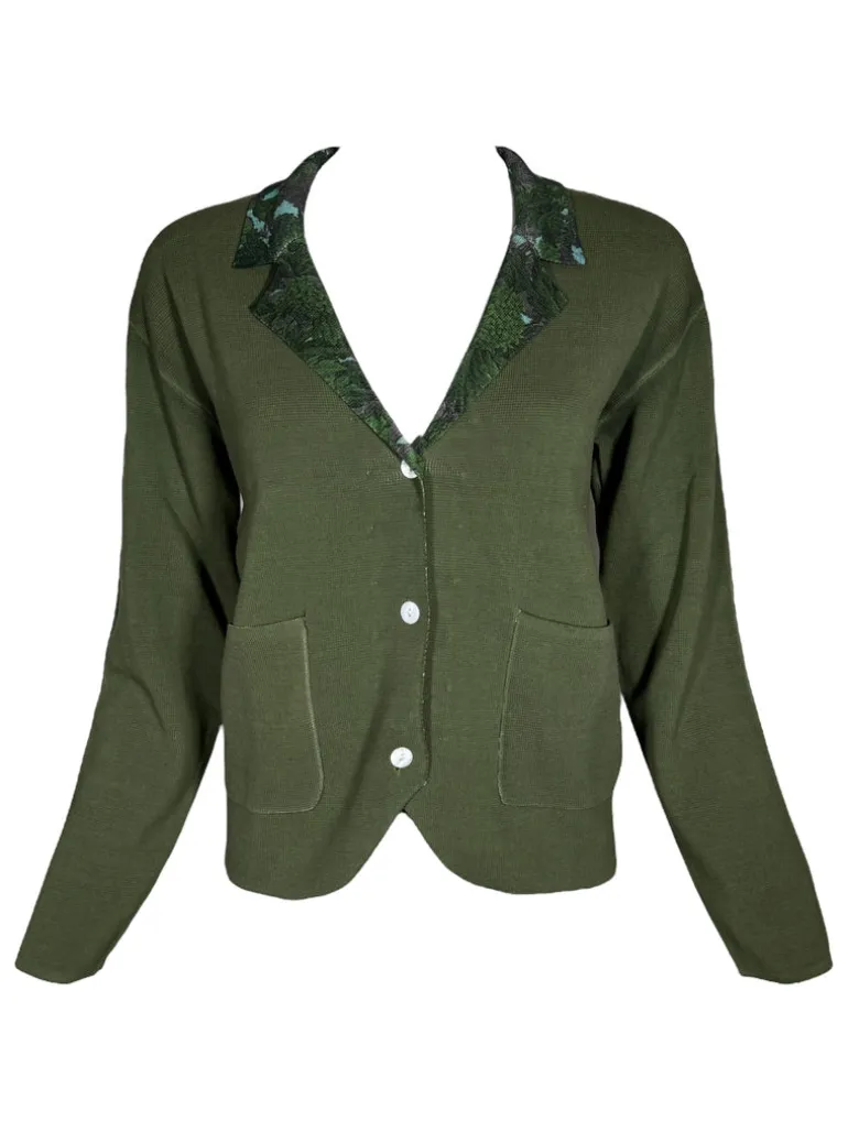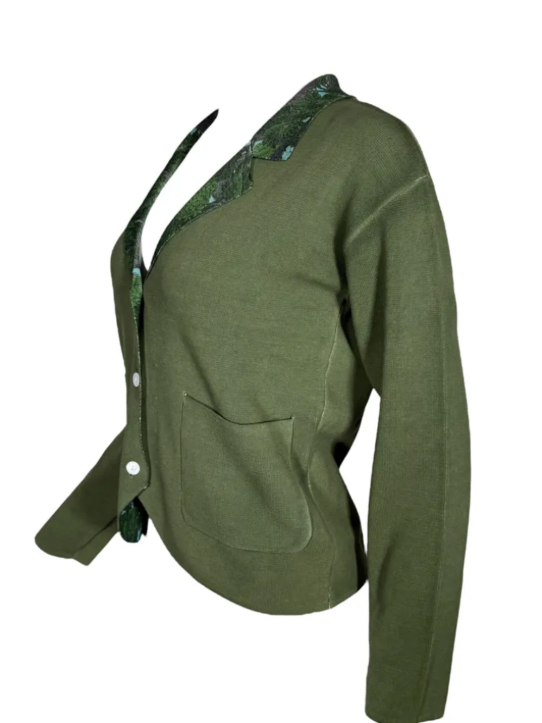 Hand printed for a unique design. Knit blazer with 3 button closure and patch pockets.
