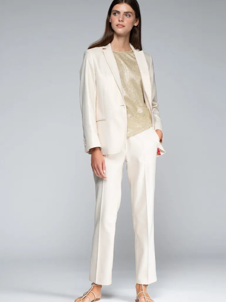 White trousers with metallic gold. Elastic waistband and front cirre with metal button. Side pockets.